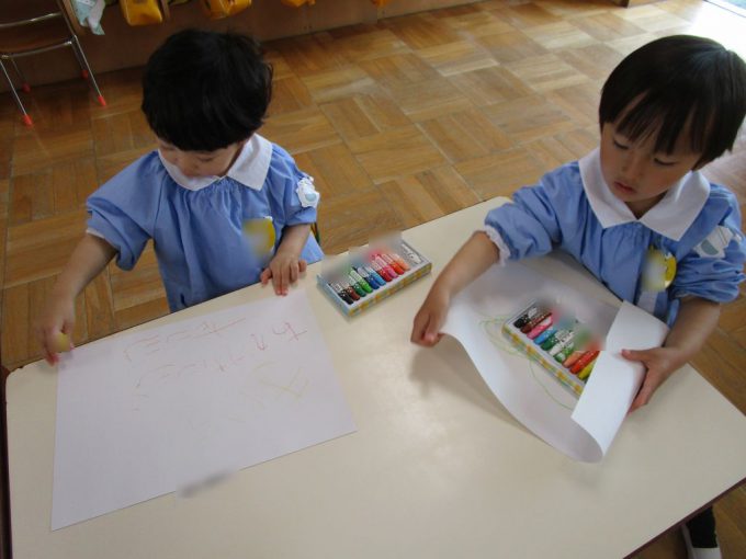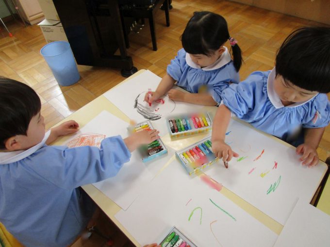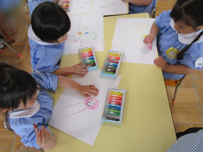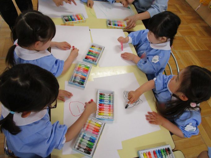 みんなでジーっとお約束を聞いてから真っ白な画用紙にたくさんの色を使ってお絵描きをしました✨